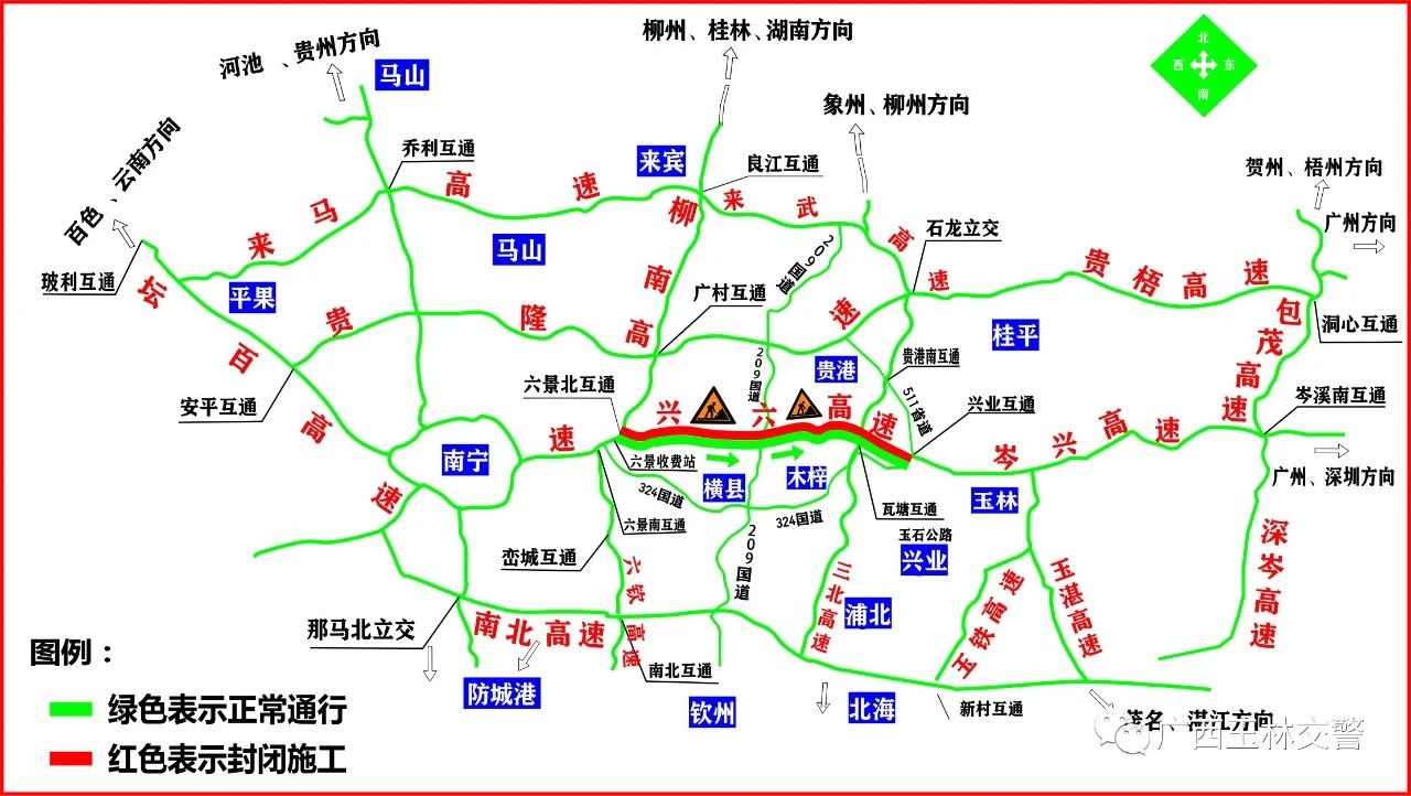 因G80广昆高速公路兴业至六景段(K397-K497)实施路面改造施工,根据施工需要,对全线约99公里分阶段实施“半幅封闭施工,另半幅单向正常通行”的交通限制措施。现南宁往玉林方向已提前完成施工,于2020年12月15日开放交通。昆明、南宁往广州、玉林方向正常通行。